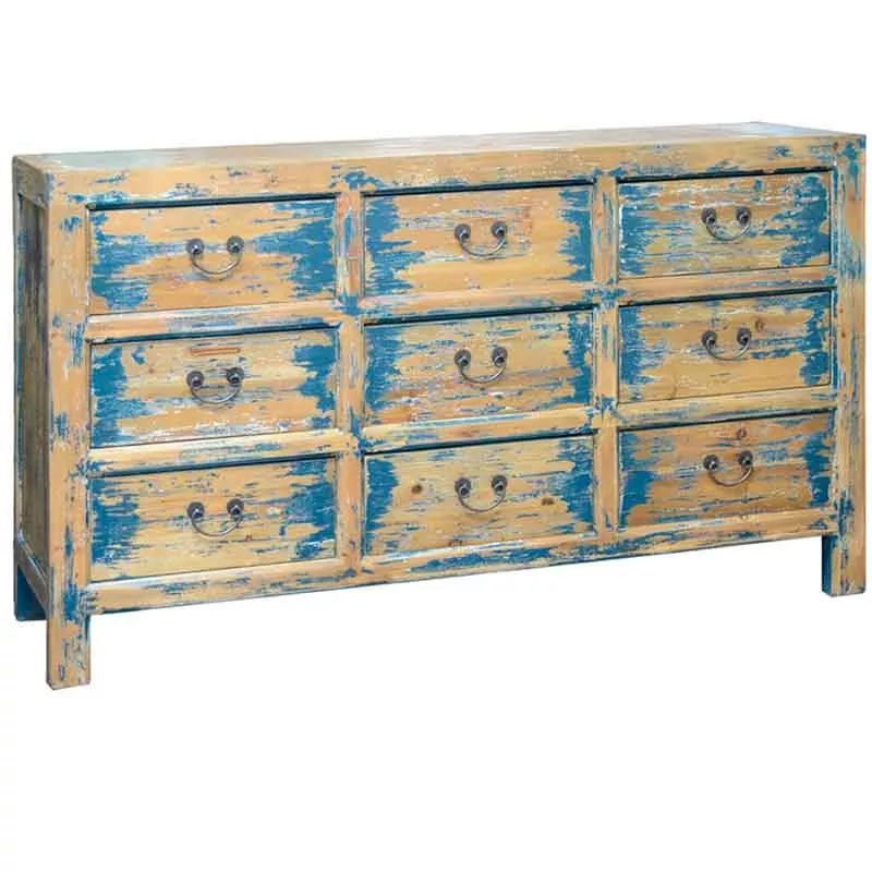 Cajonera de estilo romántico fabricada a mano con madera de pino maciza con pinceladas en color azul efecto rozado que le aportan personalidad. Sus 9 cajones te permiten un buen espacio de almacenaje para multitud de objetos y textil.